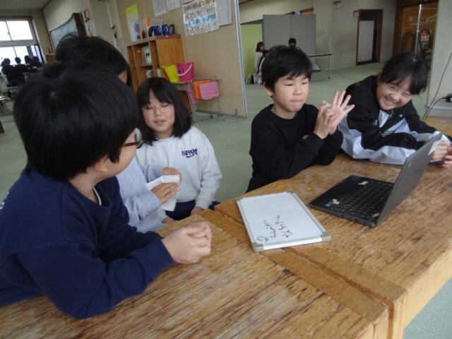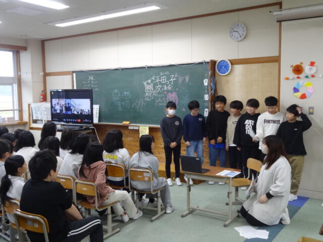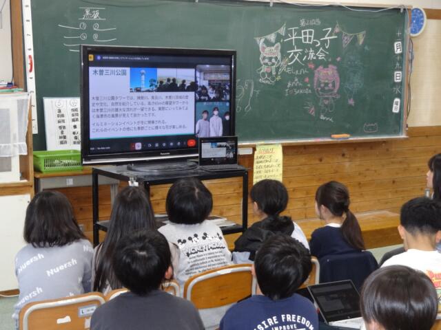 5年生が、岐阜県海津市立海西小学校との2回目のオンライン交流会を行いました。今回は、それぞれの市のことを紹介しあい、その後、ゲームなどをして交流しました。「画面越しで交流は深まるのか?」という校長の不安を、子供たちは軽々と飛び越えてくれます。今回も、笑顔あふれる交流会になりました。