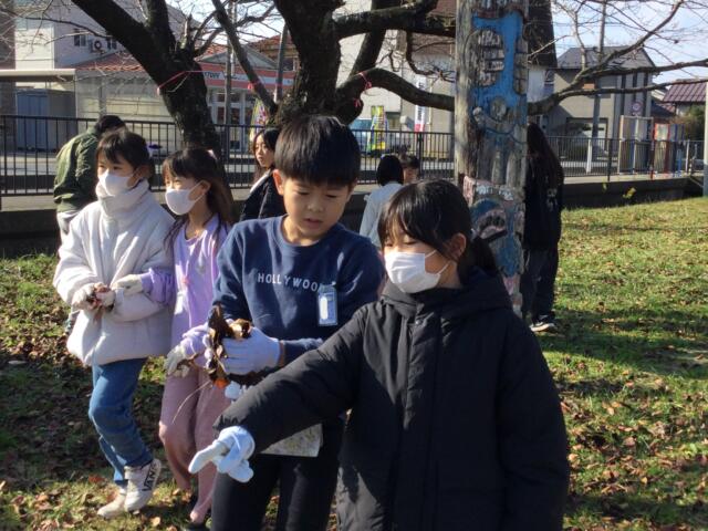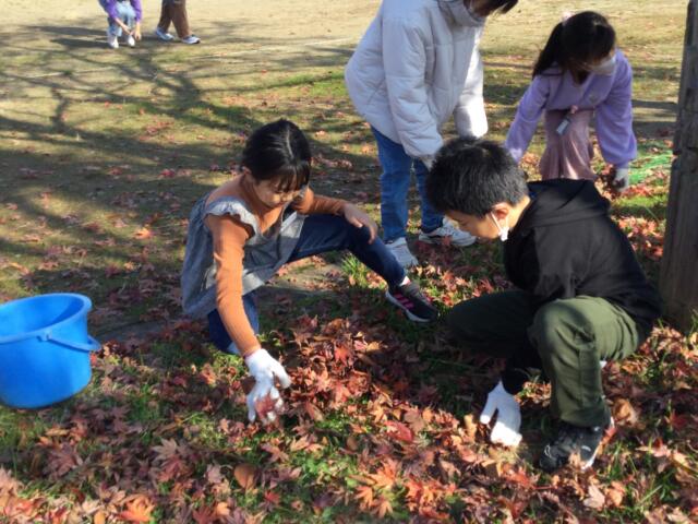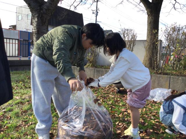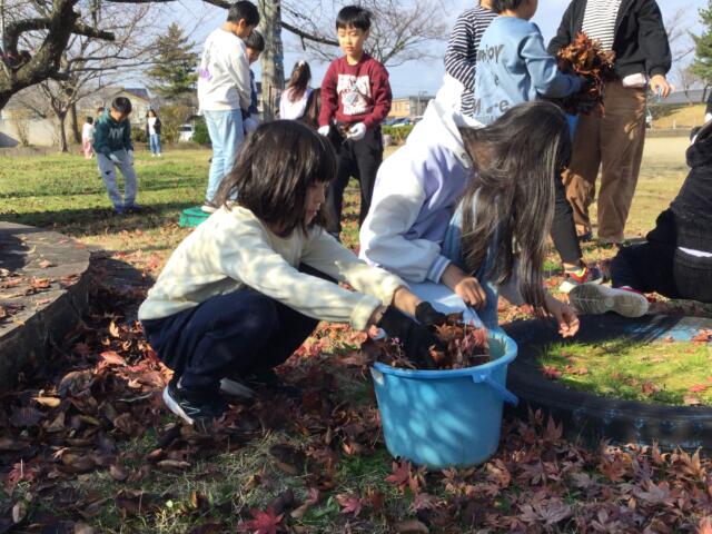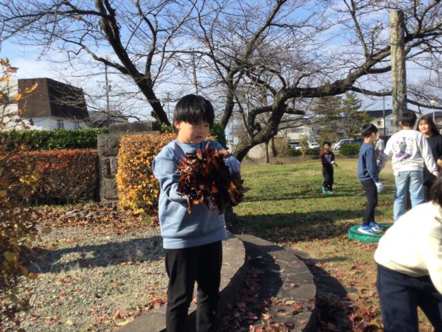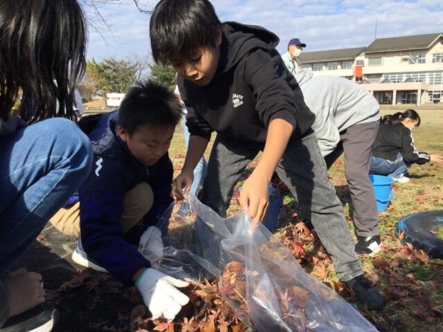 3年生と6年生が、合同で落ち葉集めをしました。集めた落ち葉は、ひらた里山の会の皆さんから腐葉土にしてもらいます。2年後、できた腐葉土を使って栽培活動を行います。資源の循環を身をもって学んでいます。