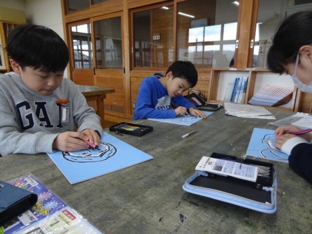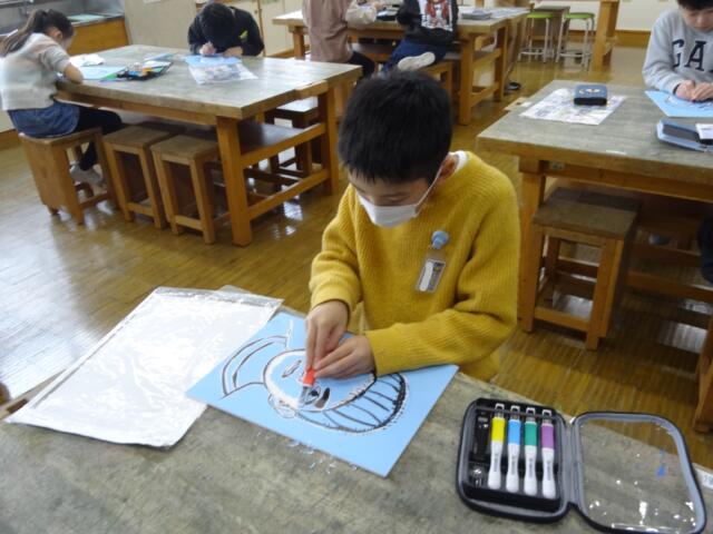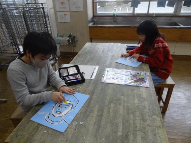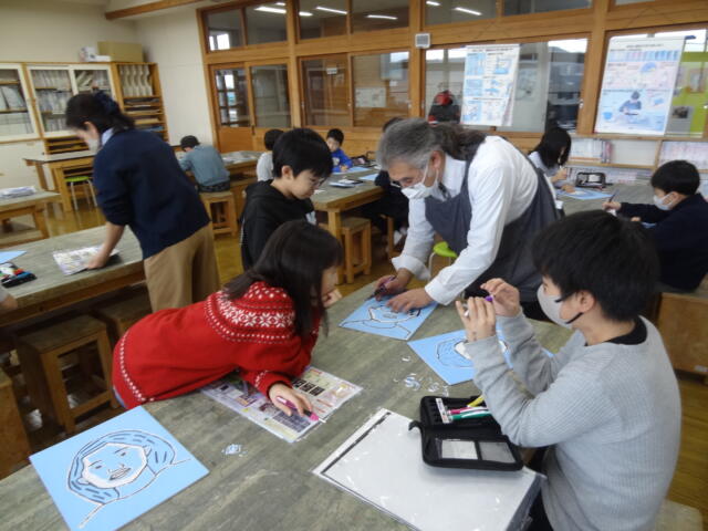 4年生が木版画の学習をしていました。自画像のようですが、自分の顔の特徴を上手にとらえていました。