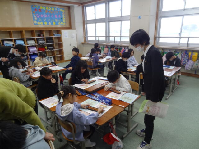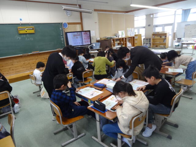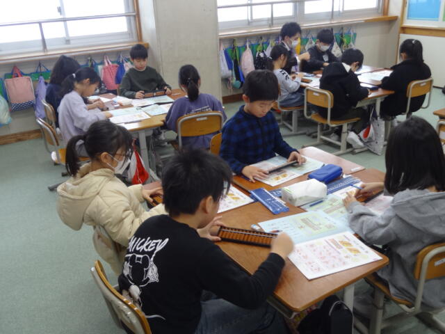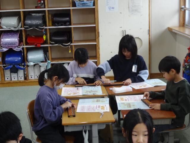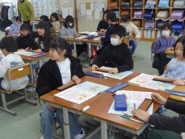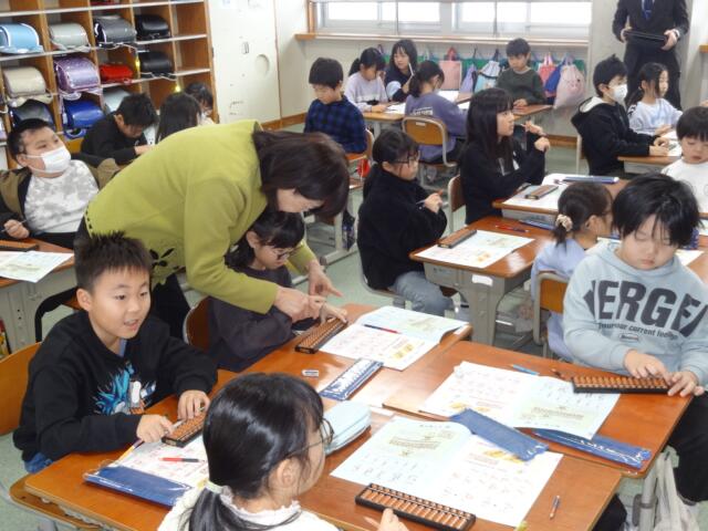 酒田珠算連盟の方々を講師としてお招きして、3,4年生がそろばんの学習をしました。「電卓があるのに、なんでそろばん?」と思われる方もいらっしゃるかもしれませんが、そろばんの仕組みに着目して、大きな数や小数の計算を考えることで、思考力の向上を図ります。子供たちは、興味をもって取り組んでいました。