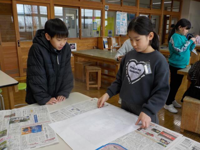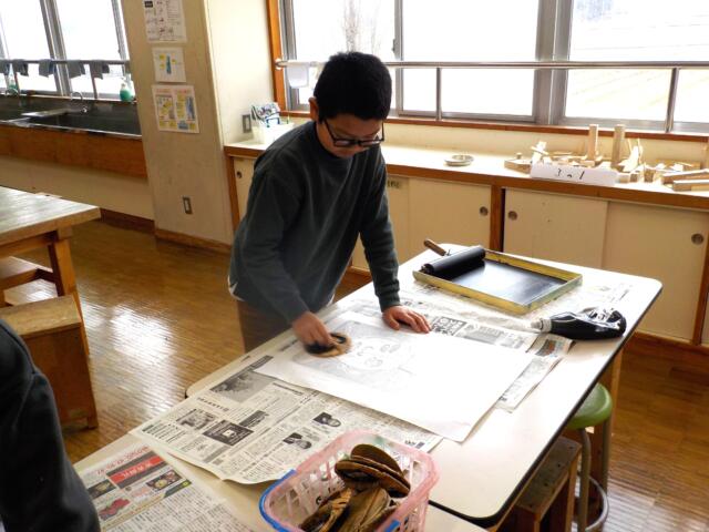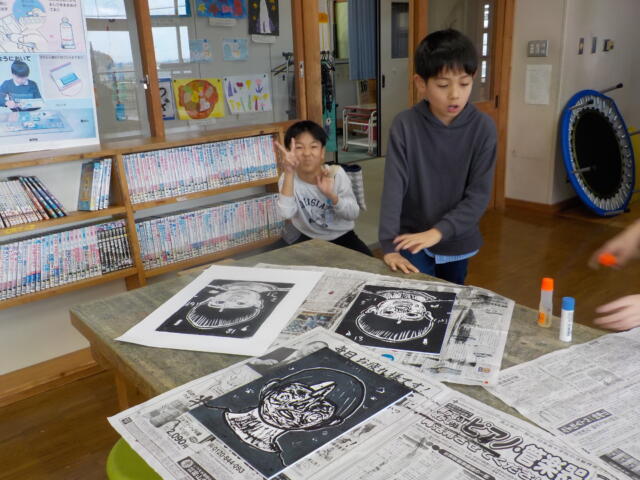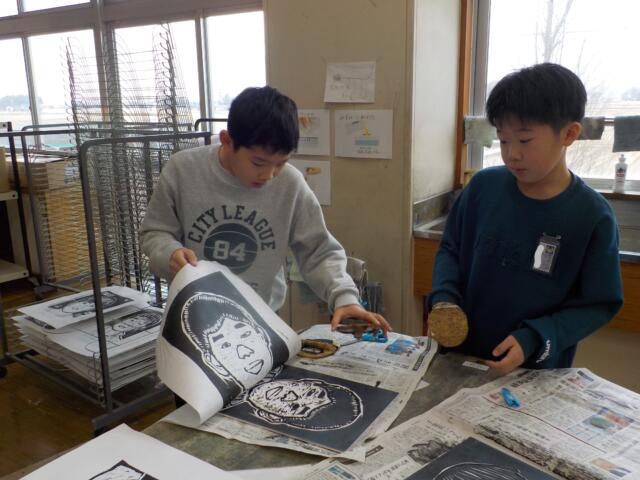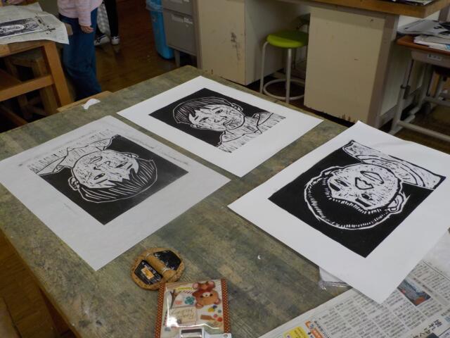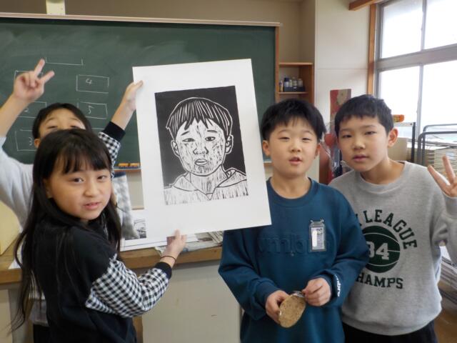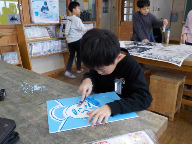 4年生が図工の時間に取り組んでいる版画ですが、着々と完成しています。それにしても、本人そっくりな作品が多く驚きました。
