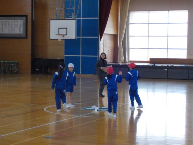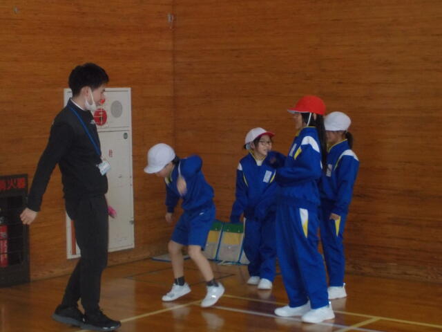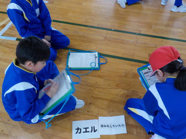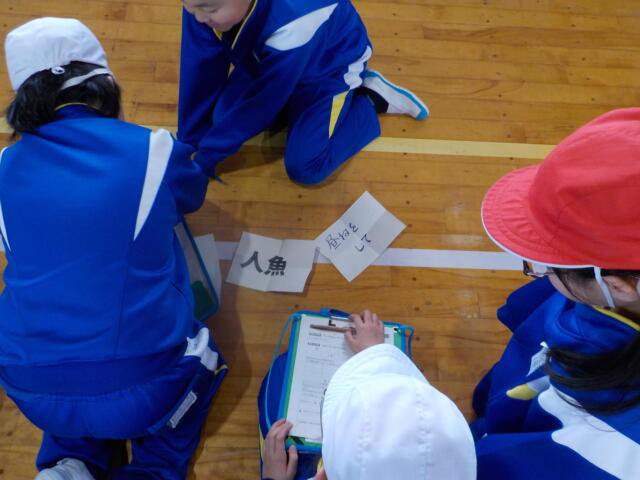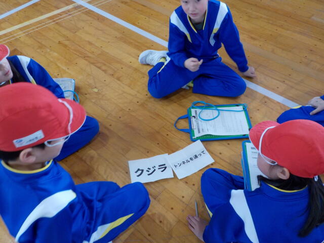 写真は、3年生の体育「表現運動」の学習です。各グループに与えられたお題に従って、動きを工夫しながら創っていました。