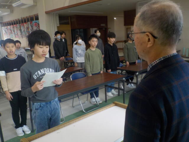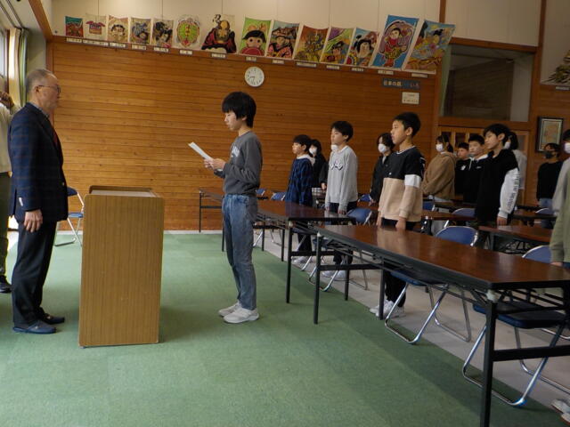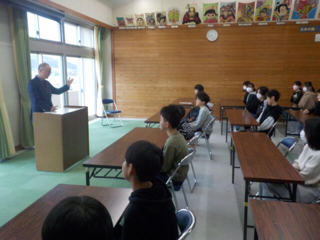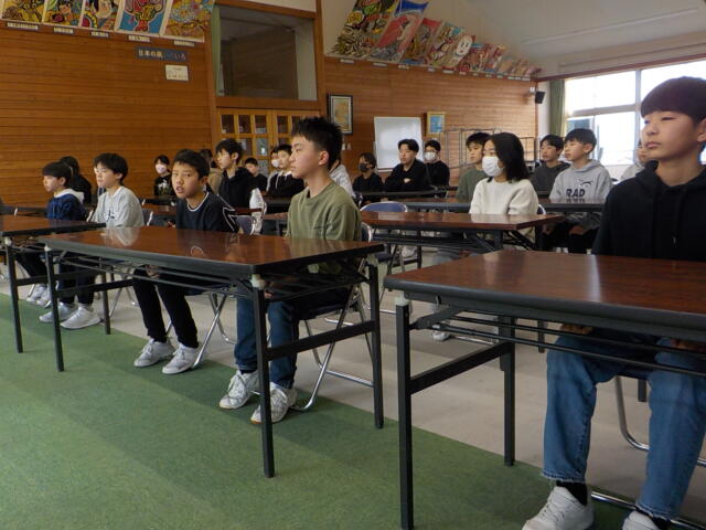 同窓会長さんをお招きして、令和7年度の同窓会入会式を行いました。同窓会長さんからは、江戸時代後期の思想家である吉田松陰の「学び続ける人は、ずっと輝く」という言葉を引用しながら、中学校でも学び続けてほしいというメッセージをいただきました。